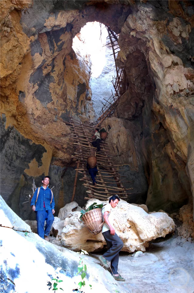 在这里,还能看到猪笼洞——这是凌云县浩坤村曾经通往外界的天然通道,因形似猪笼得名。在这个垂直深度约70米的天然坑洞内,设有竹木结构的简易绳梯。2003年前,千余村民需要背负物资攀爬绳梯出行,这段历史随着浩坤公路的建成而结束。如今,洞内还保留着原有绳梯结构,游客可以尝试攀爬一小段。