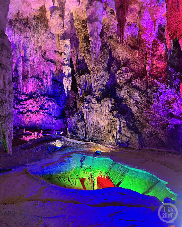 “金银双塔”石笋高耸入云,仿佛一座天然雕塑;“壮乡梯田”石幔层层叠叠,仿佛把山里的稻田搬进了溶洞。现代灯光与声效的加入,让整个溶洞宛如一场视觉盛宴。