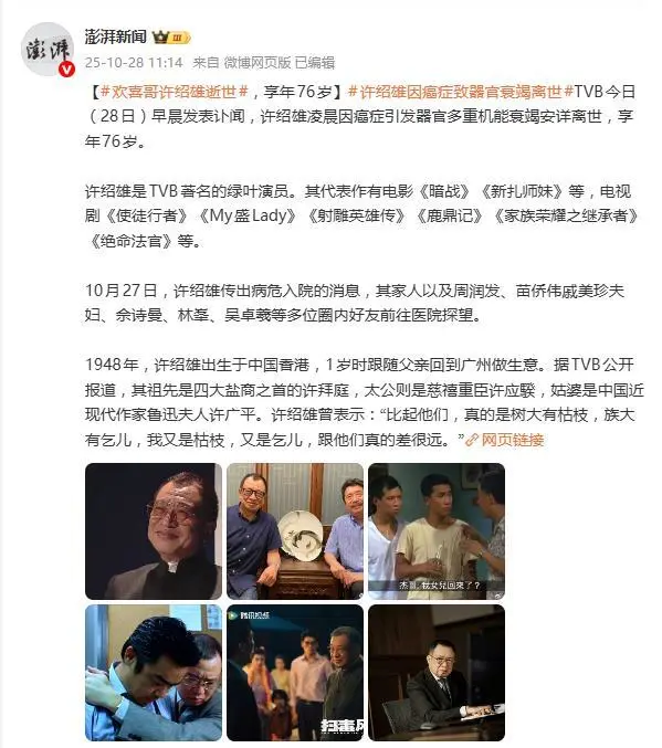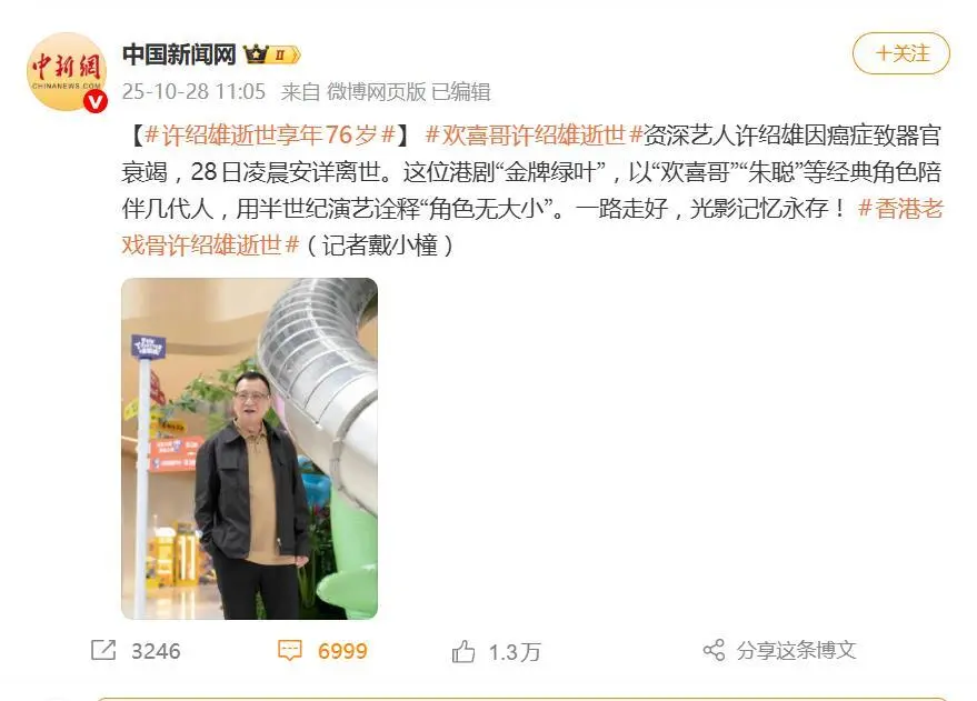 “再也听不到那句‘我是覃欢喜’了……”10月28日凌晨,香港资深演员许绍雄因癌症导致多器官衰竭快牛盘,在家人陪伴下安详离世,享年76岁的消息刷屏全网。短短12小时内,# 许绍雄逝世# #欢喜哥一路走好# 两大话题阅读量突破12亿,佘诗曼泪洒医院、周润发深夜送别、林峯双手合十祈福的画面,让无数网友在回忆与悲痛中感叹:“港剧黄金时代的一片重要绿叶,落了。”
